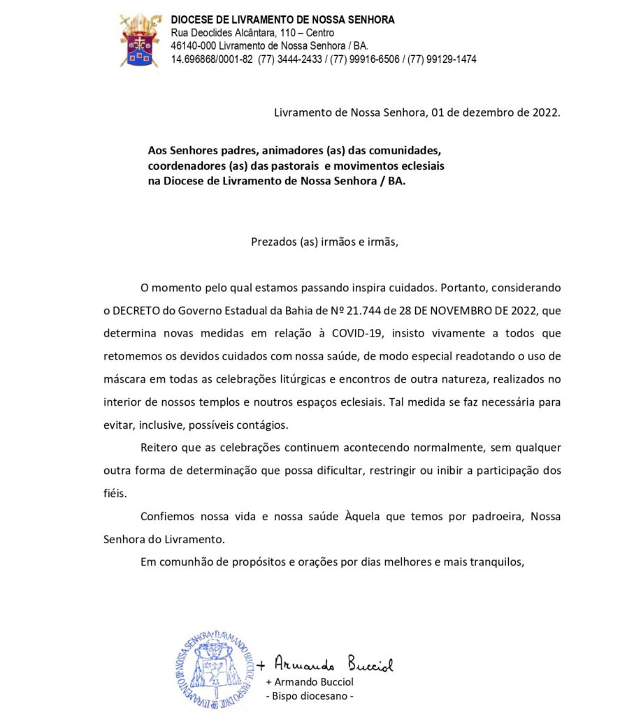 O momento pelo qual estamos passando inspira cuidados. Portanto, considerando o DECRETO do Governo Estadual da Bahia de Nº 21.744 de 28 DE NOVEMBRO DE 2022, que determina novas medidas em relação à COVID-19, insisto vivamente a todos que retomemos os devidos cuidados com nossa saúde, de modo especial readotando o uso de máscara em todas as celebrações litúrgicas e encontros de outra natureza, realizados no interior de nossos templos e noutros espaços eclesiais. Tal medida se faz necessária para evitar, inclusive, possíveis contágios. Reitero que as celebrações continuem acontecendo normalmente, sem qualquer outra forma de determinação que possa dificultar, restringir ou inibir a participação dos fiéis. Confiemos nossa vida e nossa saúde Àquela que temos por padroeira, Nossa Senhora do Livramento. Em comunhão de propósitos e orações por dias melhores e mais tranquilos,